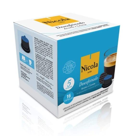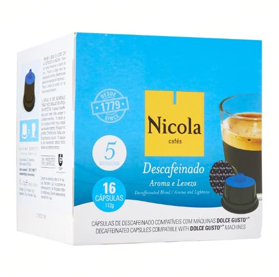 Nicola Cafes Coffee Capsules Compatible For Dolce Gusto Machines Descafeinado ( 16capsules x 7g ) 112G – All the characteristics of a good coffee, but without caffeine. Perfect for a relaxing Encounter.