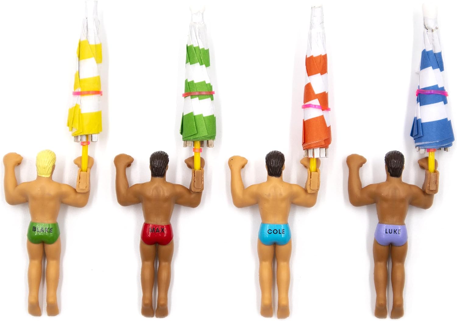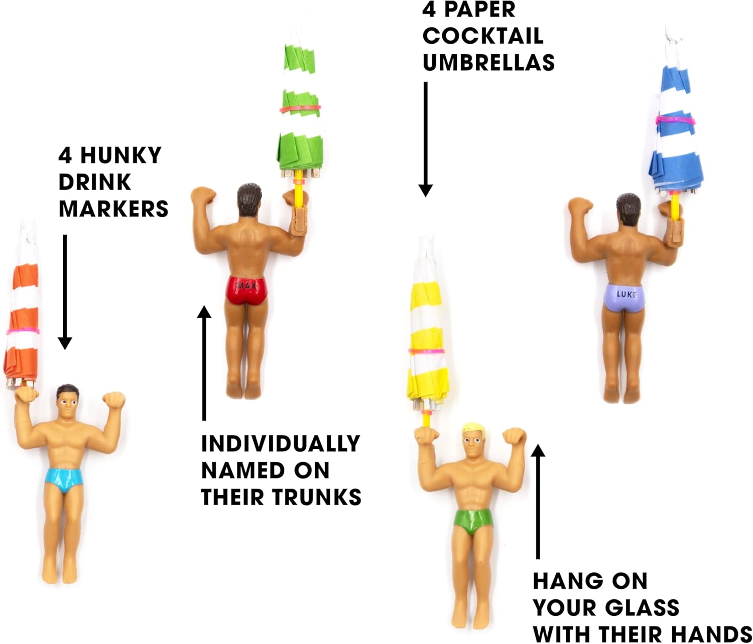 4 Drinking Buddies with hands molded to hold a drinking umbrella. Pack comes with 4 disposable cocktail umbrellas.