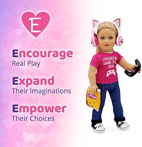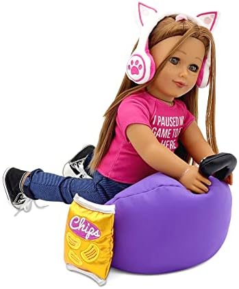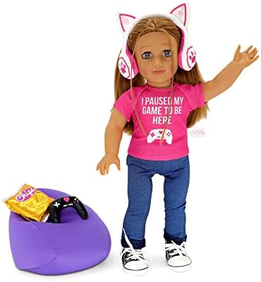 Doll Outfit and Accessories Set – This gamer set includes a cute and quirky pink t-shirt, blue jeans, black sneakers, cute cat ear headphones, plush bean bag chair, game controller, and a plush bag of chips! Doll not Included.