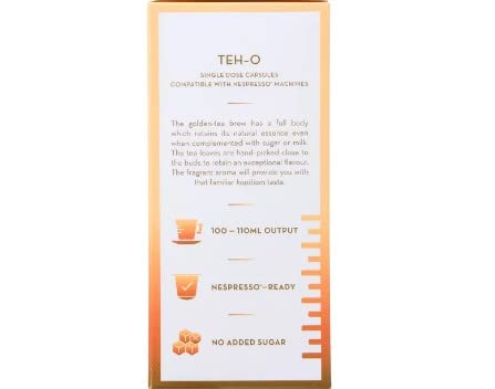 The golden tea brew has a full body which retains its natural essence even when complemented with sugar or milk. The tea leaves are hand picked close to the buds to retain an exceptional flavour. The fragrant aroma will provide you with that familiar kopitiam taste. Curated tea dust to produce the same familiar kopitiam taste. Recommended Lungo volume of 110 ml. Add condensed milk directly to taste to get a full bodied Teh. Add water if taste is too strong (acidic) All natural, no additional flavour enhancers and preservatives added. Nespresso Compatible Capsules Strength – 4.5 out of 5 on the lungo option (approx. 100 – 110 ml depending on machine settings). Black tea leaves are ground to dust and packed with precision to ensure a great extraction. Depending on your preference, you could extract the Teh-O capsule once via the bigger lungo option (bigger cup icon) and once morevia the espresso option (smaller cup icon) to get a milder taste. Recommended use: Flush the system – This ensures that the temperature of the water going through the capsule is optimal. Insert capsule and select volume –Choose lungo (bigger cup icon) once for a strong brew or once more via the espresso option (smaller cup icon) to get a milder brew. Watch the magic happen – Smell the fine fragrance of the tea. Extraction could take up to a minute depending on machine settings. Add your condiments – Recreate traditional kopitiam drinks by adding sugar, condensed milk or evaporated milk (you can even add them all!) to taste. Enjoy your beverage – Sit back and savour your tea. Service per package: 10 Serving size: 4.6 g per capsule