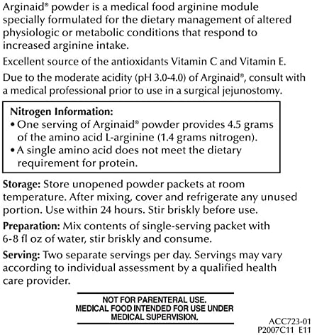 RESOURCE ARGINAID Drink Mix is an arginine-intensive powder formulated for patients recovering from burns, surgery, or chronic wounds. Each serving contains 4.5 g of L-arginine along with supplemental vitamins C and E. RESOURCE ARGINAID mixes easily with water and is available in three delicious fruit flavors: Lemon, Orange, and Cherry.