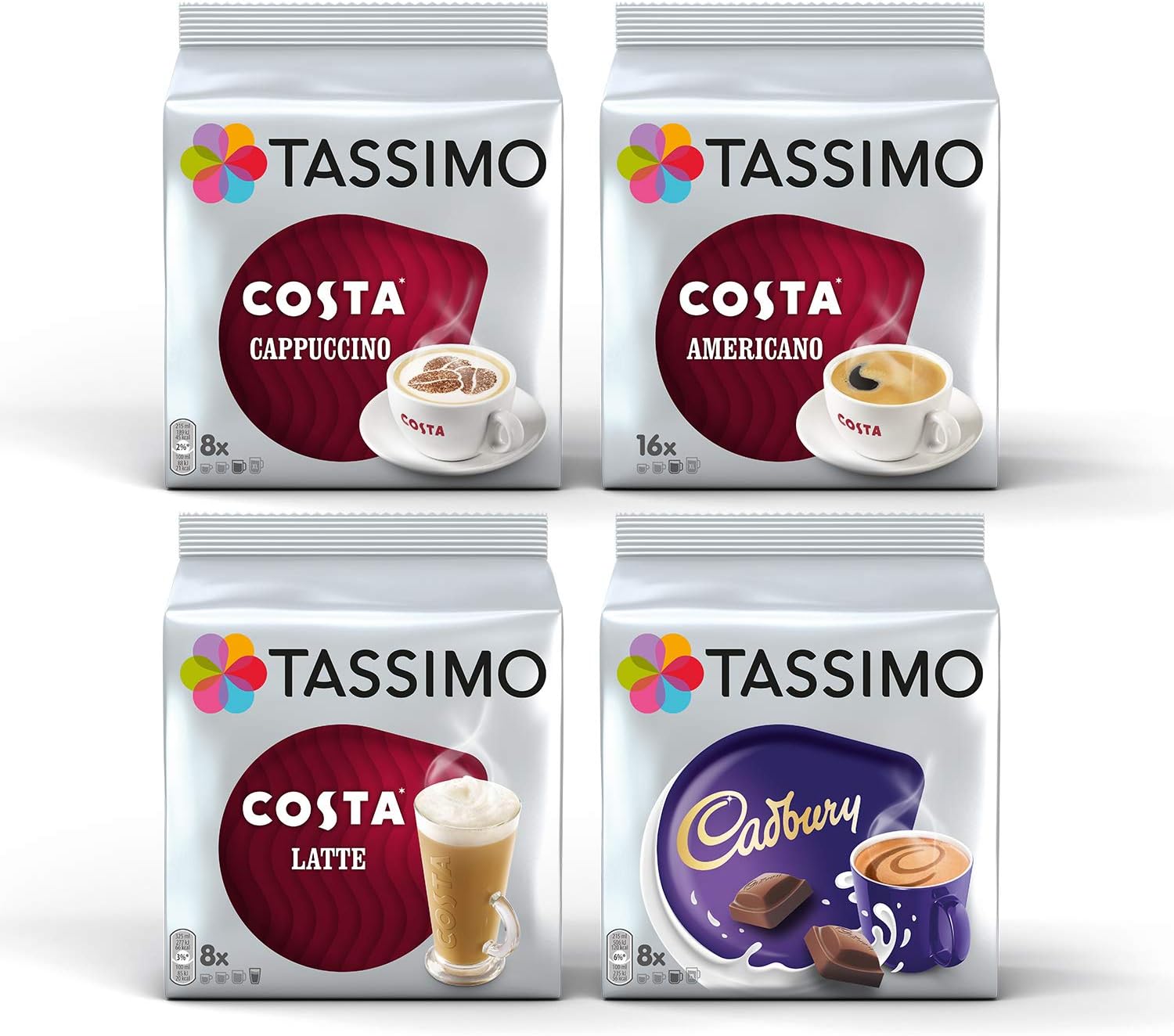 Tassimo Costa Cappuccino//Latte/Americano/Cadbury X 4 Packs Set = 40 Drinks